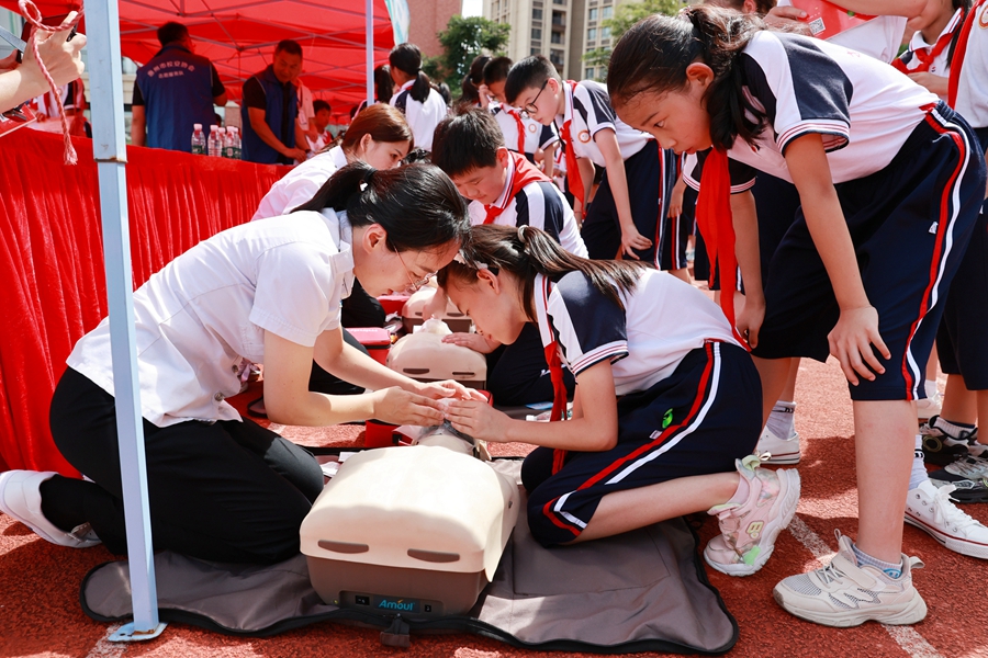 學(xué)生學(xué)習(xí)心肺復(fù)蘇等基本急救技能;葜萑?qǐng)?bào)記者邱舒婷 通訊員凌小花 攝