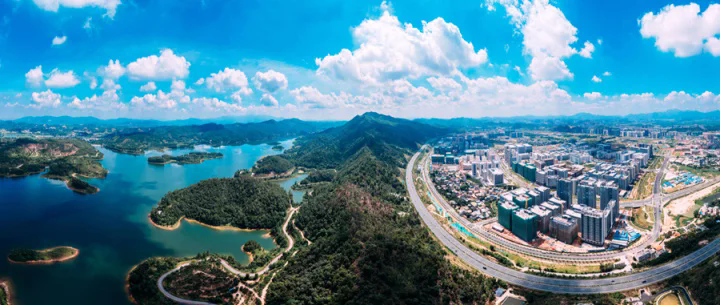 無人機(jī)視角下,左側(cè)為觀洞水庫,右側(cè)為中韓(惠州)產(chǎn)業(yè)園,繪出一幅生態(tài)宜居、和諧發(fā)展的美麗畫卷;輬(bào)全媒體記者邱舒婷 通訊員李明 供圖