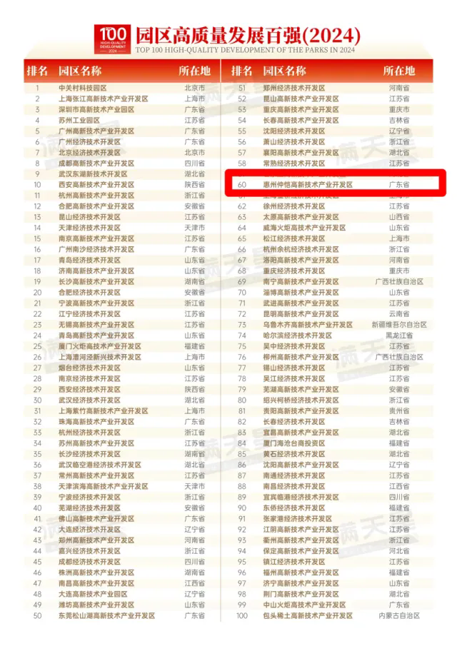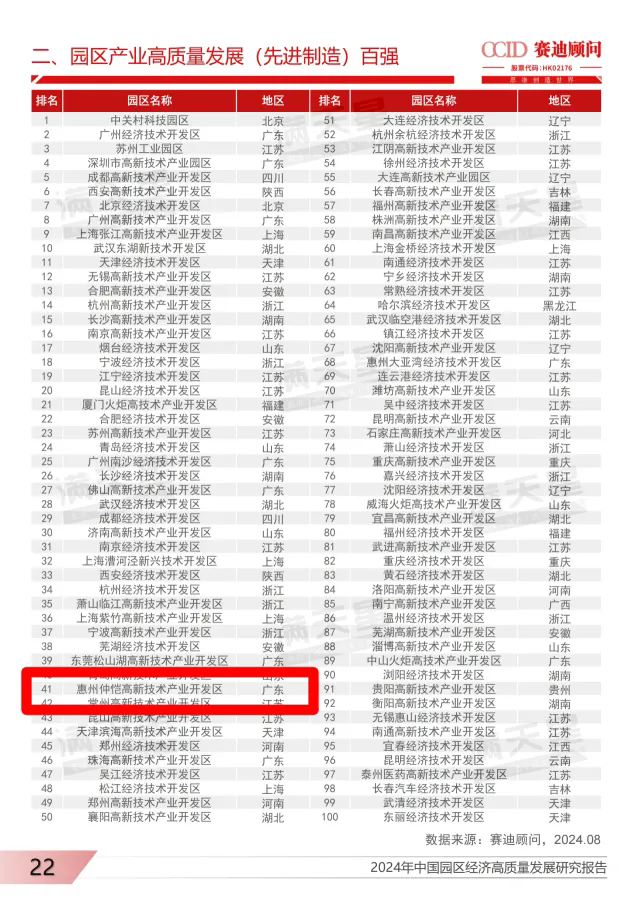 8月15日,研究機(jī)構(gòu)賽迪顧問全文發(fā)布《2024年中國園區(qū)經(jīng)濟(jì)高質(zhì)量發(fā)展研究報告》(下稱《報告》),公布“園區(qū)高質(zhì)量發(fā)展百強(qiáng)(2024)”榜單。其中,仲愷高新區(qū)上榜,成為惠州唯一入選的園區(qū)。