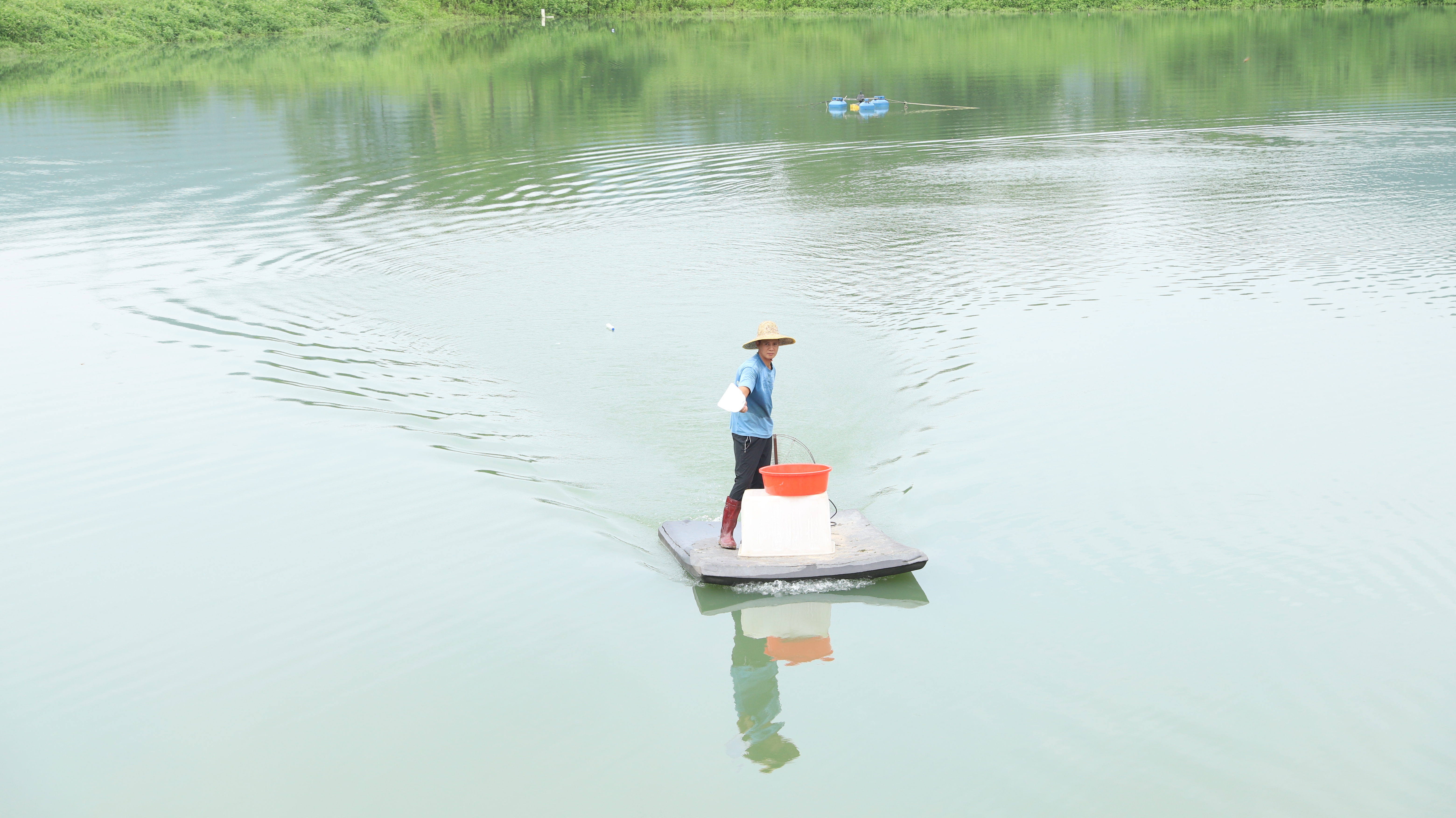 養(yǎng)殖員在水塘給蝦喂食;葜萑?qǐng)?bào)記者鐘暢新 攝