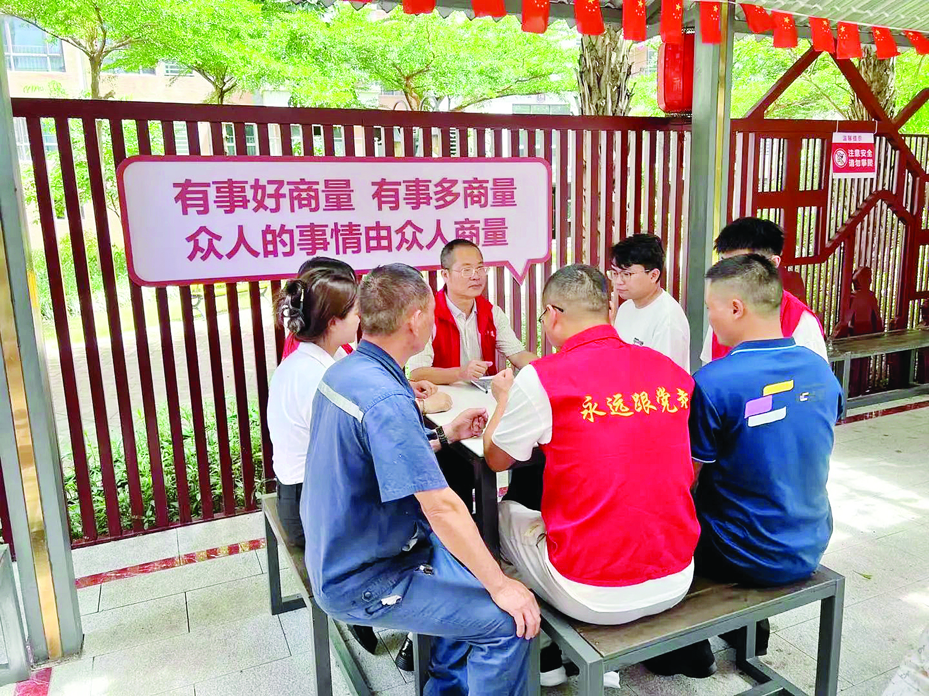 “把支部建在小區(qū)后,基層黨建的觸角就延伸到了小區(qū)這個最小的城市單元。在這里,物業(yè)、業(yè)委會、黨員業(yè)主及熱心業(yè)主等多方力量匯聚一堂,面對面探討小區(qū)治理中的熱點難點問題。”陳江街道綜治中心負責人介紹,為進一步暢通民意渠道,陳江街道創(chuàng)新性地建立了“先鋒小區(qū)”議事會制度,推動居民協(xié)商議事常態(tài)化、制度化。當小區(qū)群眾帶著各種問題和心情來訪時,議事員當起調解者,以“議事亭”為樞紐,巧調“千家事”,用“小協(xié)商”解決“大民生”。對于難以在小區(qū)層面解決的問題,則通過層層上報至社區(qū)或街道“先鋒小區(qū)”聯(lián)席會議的方式,進行多輪協(xié)商直至達成共識,實現(xiàn)了矛盾糾紛的有效化解和源頭治理。