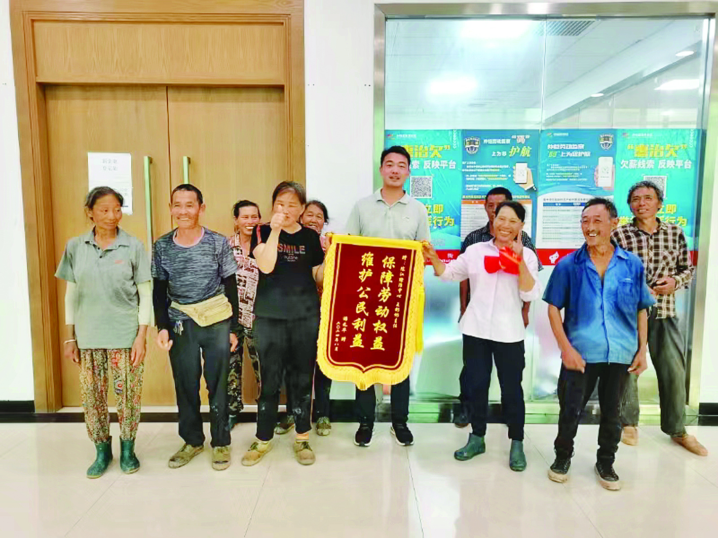 在拿到被拖欠2年的工資后,受助工人喜贈錦旗。