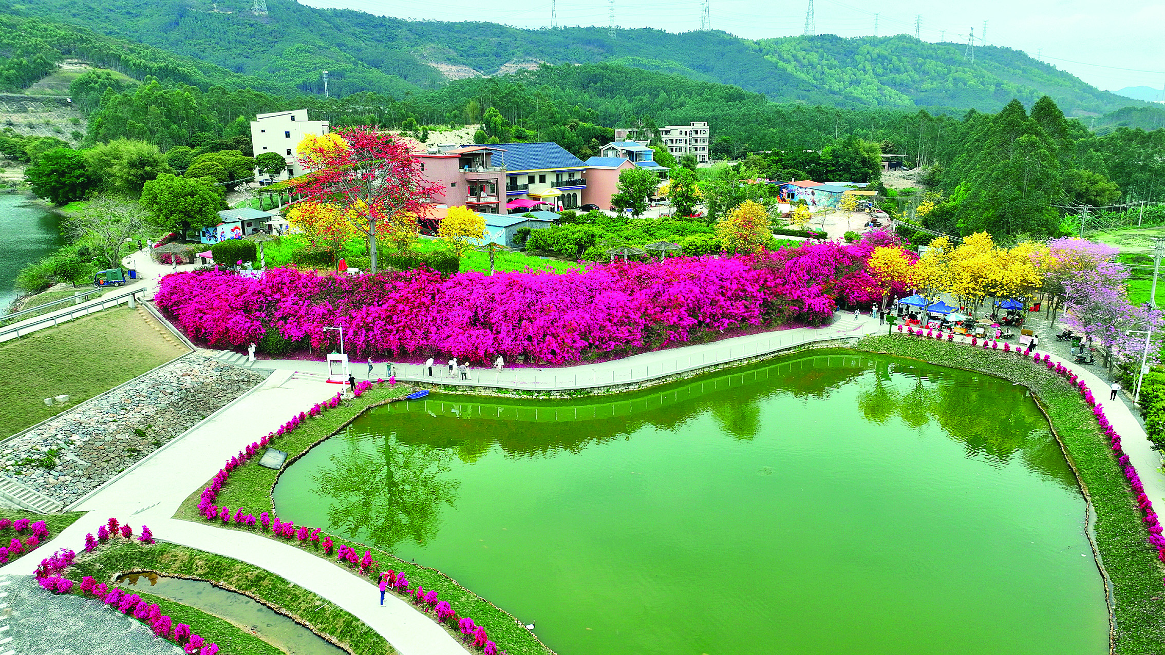 今年春節(jié)前夕,黃屋村啟動建設(shè)“三角梅瀑布”周邊閑置土地改造升級項目,僅1個月時間就完成蛻變:石板路蜿蜒入景,玻璃護欄倒映花海,沿道三角梅點綴成景,臨時商業(yè)區(qū)域顯雛形……以三角梅為特色的村級公園儼然成形。
