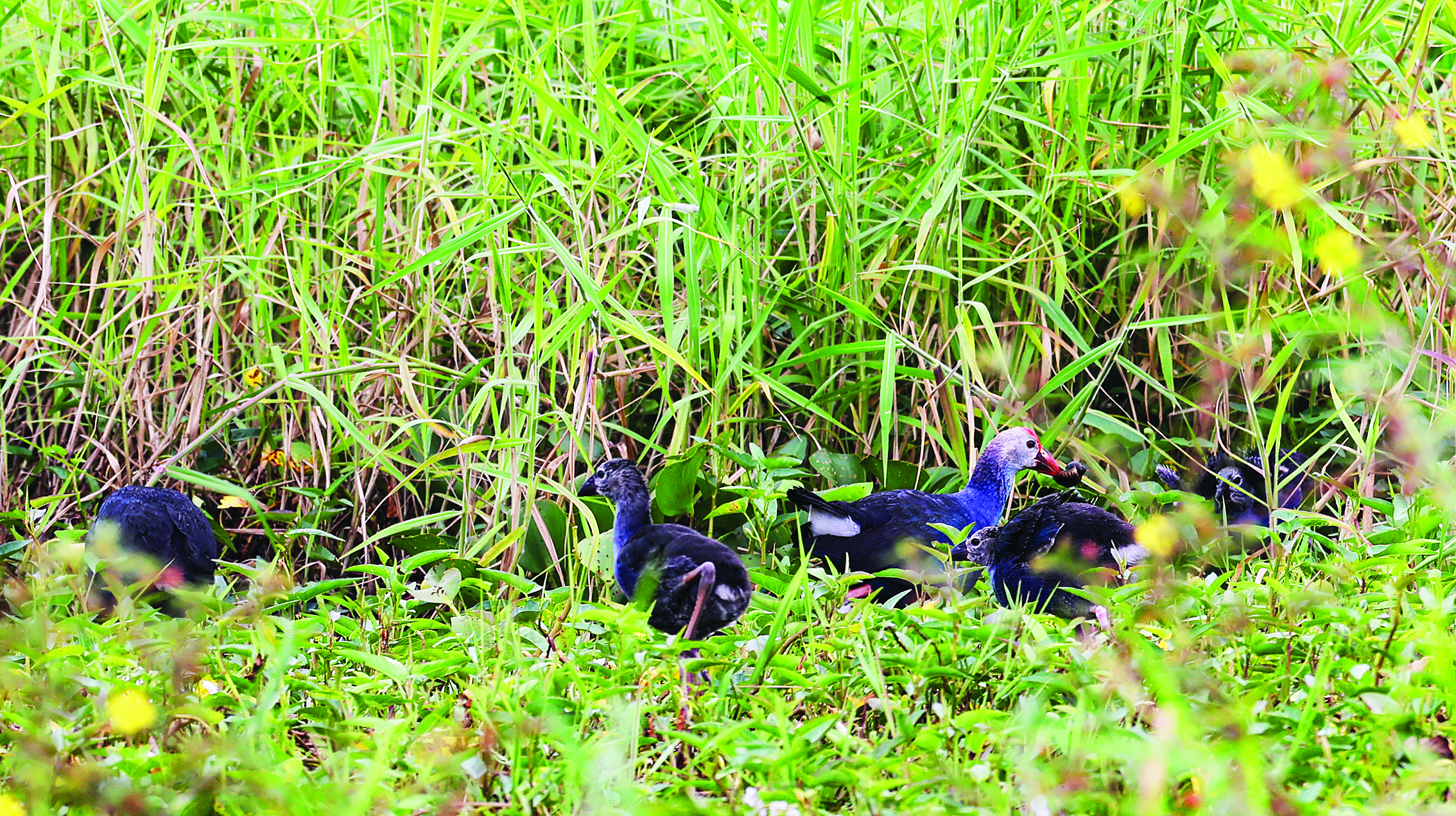 紫水雞在水草叢中覓食;葜萑?qǐng)?bào)記者王建橋 通訊員陳丹芝 攝
