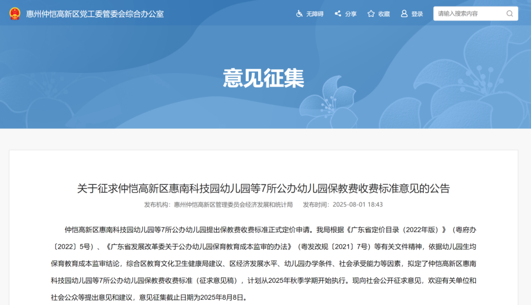 日前,仲愷高新區(qū)管理委員會經(jīng)濟(jì)發(fā)展和統(tǒng)計局發(fā)布《關(guān)于征求仲愷高新區(qū)惠南科技園幼兒園等7所公辦幼兒園保教費收費標(biāo)準(zhǔn)意見的公告》,計劃從今年秋季學(xué)期開始,調(diào)整7所公辦幼兒園的保教費。