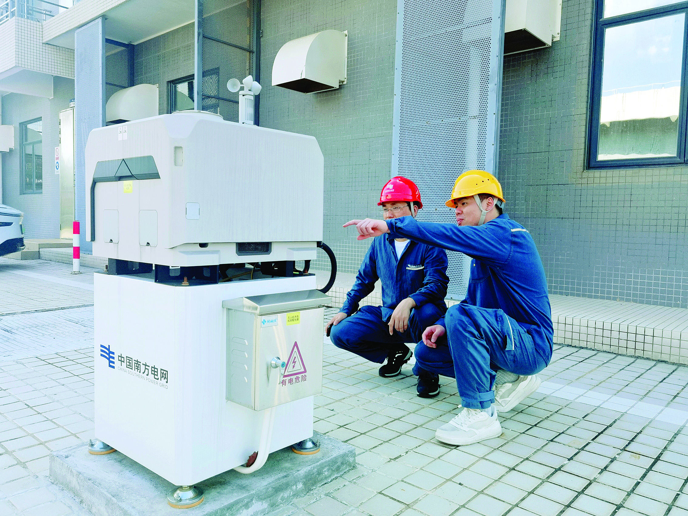 仲愷供電局營配指揮中心人員正在對500千伏演達變電站組網(wǎng)部署機巢設(shè)備進行檢查確認;葜萑請笥浾邉⒁叶 通訊員楊柳青 攝