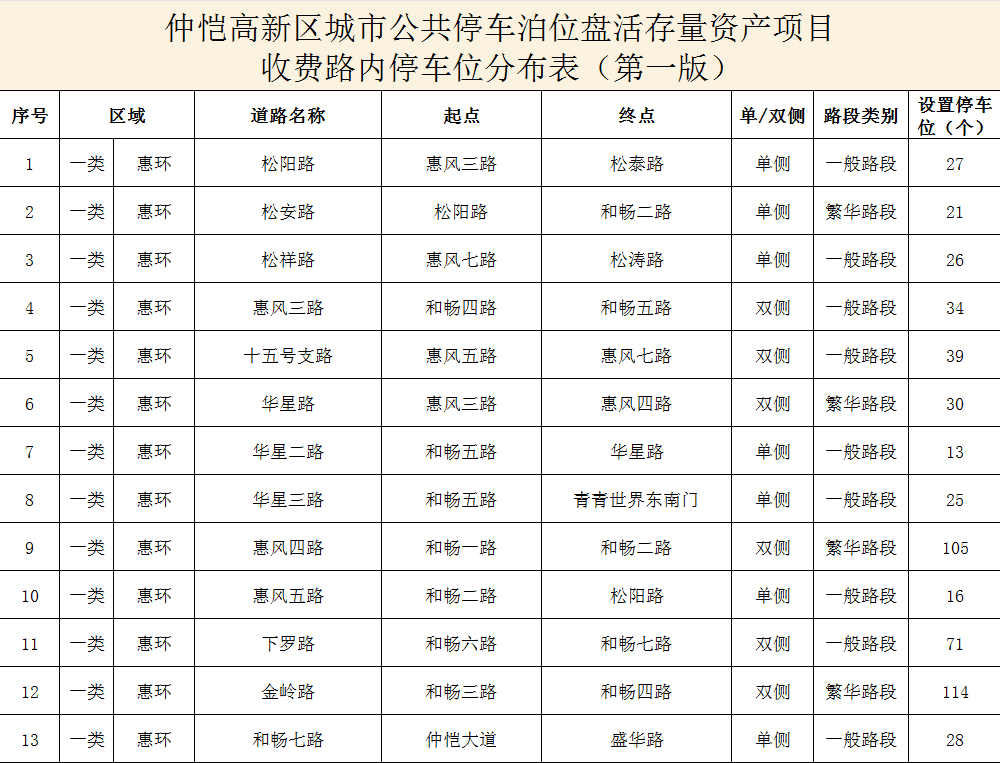 (項目收費路內停車位分布表)