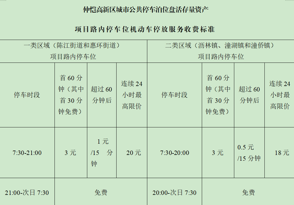 本次收費實行政府指導價管理,并采取分區(qū)域差異化收費標準,將全區(qū)劃分為一類區(qū)域(惠環(huán)街道、陳江街道)和二類區(qū)域(瀝林鎮(zhèn)、潼湖鎮(zhèn)、潼僑鎮(zhèn)),以契合不同區(qū)域的交通壓力和停車需求。收費標準實行政府指導價管理,公布的均為最高限價。