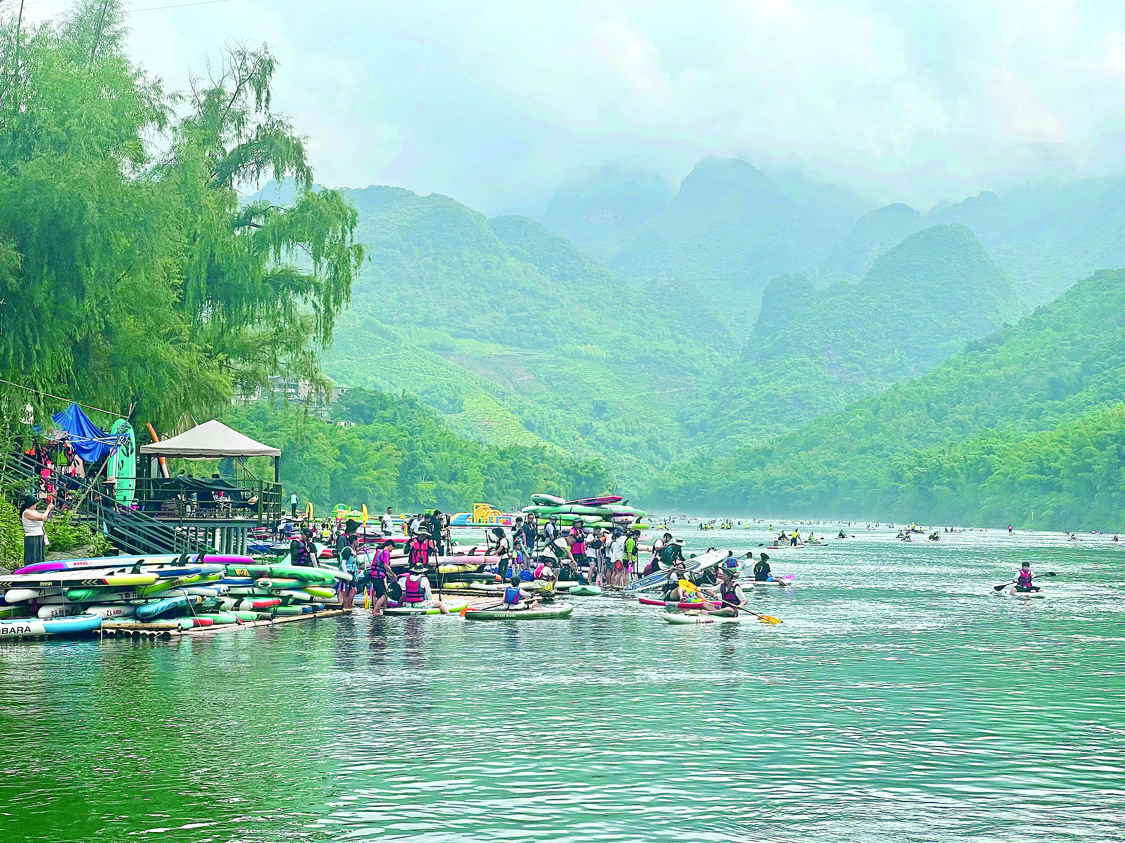 “加油!加油!加油……”去年夏天,2024年中國百城槳板公開賽(安龍站)在此開賽,來自廣東、上海等地的120余名槳板選手在南盤江上競技,吸引游客關(guān)注,“壩爾代夫”的美名隨賽事傳遍網(wǎng)絡(luò)。自公開賽在壩盤村舉辦后,這里便成為了槳板愛好者的樂園。游客量平日有約3000人,周末高峰時段高達(dá)4000余人,勞動節(jié)、國慶節(jié)假期每天多達(dá)1.7萬人!皣鴳c假期,僅槳板運動項目就給村集體經(jīng)濟增加12萬元收入。”萬峰湖鎮(zhèn)壩盤村黨支部書記、村委會主任陳啟仁說。