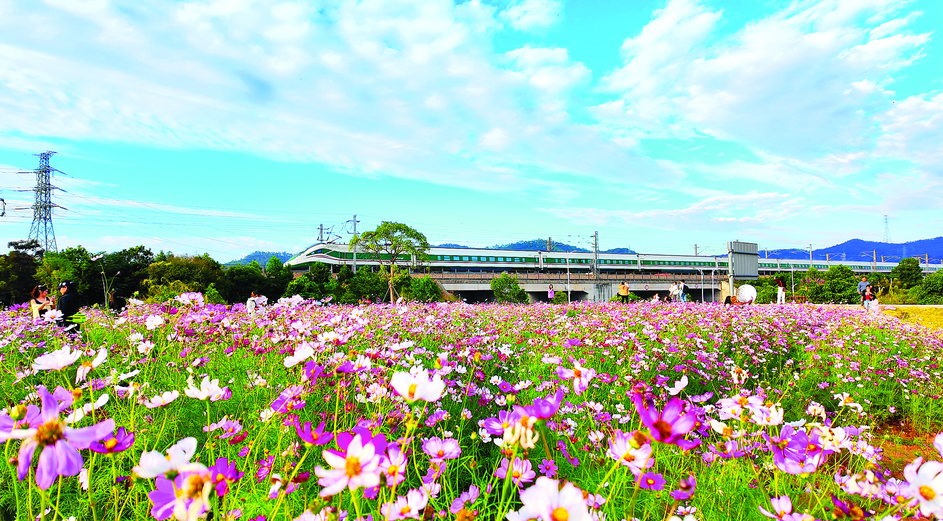 初冬的仲愷高新區(qū)陳江街道,暖陽為大地鍍上金邊。綠美黨建林內(nèi),粉白紫三色格;ㄤ佌钩衫寺ê,不遠處京九鐵路列車呼嘯而過,與藍天白云、花海人群共同定格成一幅動靜相宜的城市生態(tài)畫卷。