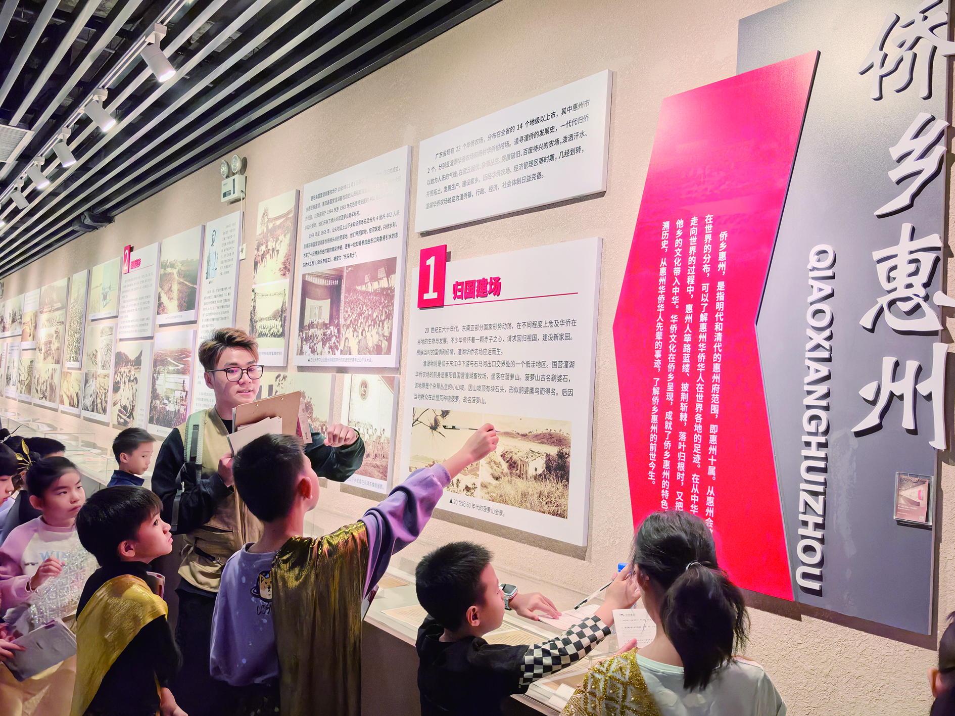 “1966年,潼湖華僑農(nóng)場成立,來自印尼、緬甸等14個(gè)國家的歸僑聚集在這里,他們把這里當(dāng)成了新家。”在“歸僑建設(shè)”展區(qū),當(dāng)年歸僑和知青開墾荒地、修建堤壩的老照片吸引了孩子們的目光。黑白影像中,歸僑們背著農(nóng)具在泥濘的土地上勞作,知青們挽著褲腳修建水庫,艱苦的環(huán)境與他們堅(jiān)毅的眼神形成鮮明對(duì)比!爱(dāng)時(shí)的潼僑‘一日大雨水汪汪,三日無雨田龜裂’,歸僑和知青們就是在這樣的地方,建起了茶園和家園!睂(dǎo)師的話語讓孩子們深受觸動(dòng),不少人拿出研學(xué)手冊(cè)認(rèn)真記錄著。