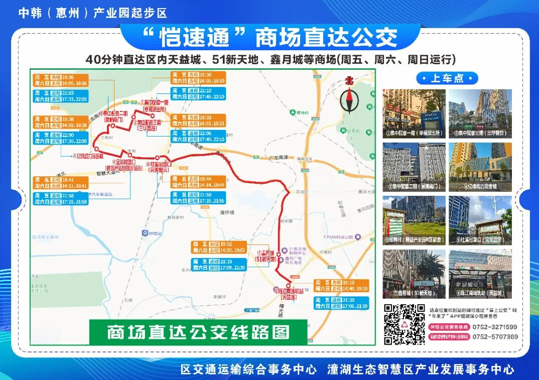 線路經(jīng)過6個(gè)精心規(guī)劃的站點(diǎn),串聯(lián)起中韓(惠州)產(chǎn)業(yè)園起步區(qū)核心居住區(qū),包括集中配套一期(幸福派出所)、集中配套三期(三華智控)、集中配套二期(豪鵬南門)、億緯動(dòng)力宿舍樓、寶崗村(群益產(chǎn)業(yè)園B區(qū)宿舍)、社溪村路口(完美顯示)。這些站點(diǎn)覆蓋了中韓(惠州)產(chǎn)業(yè)園內(nèi)主要的企業(yè)宿舍和職工居民集中區(qū)域。