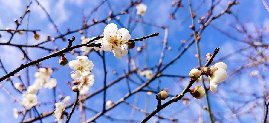 雖然第一批的梅花不算多,但靚麗的白色已經(jīng)藏不住了。漫步梅花山,盡管梅花只是星星點(diǎn)點(diǎn),但是枝頭飄白,盡顯清冷高雅。另外,許多梅花含苞待放,點(diǎn)點(diǎn)雪白爬上枝頭,為冬日帶來一抹特有的幽香。