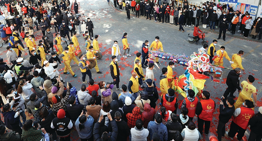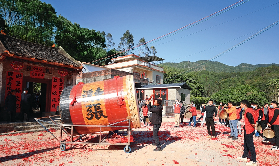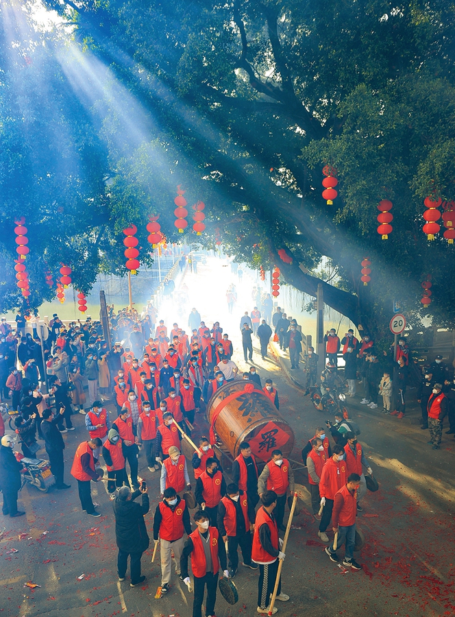 “咚,咚咚,咚咚咚……”1月29日,農(nóng)歷正月初八,時值博羅縣橫河鎮(zhèn)大部分村莊的“上燈”之日,傳承500余年的橫河大鼓也如約在圩鎮(zhèn)擂響。聲遏云霄的鼓聲,承載了鄉(xiāng)親們對國泰民安的美好祈愿,也成為當(dāng)?shù)卮迕駡F結(jié)和睦的真實寫照。