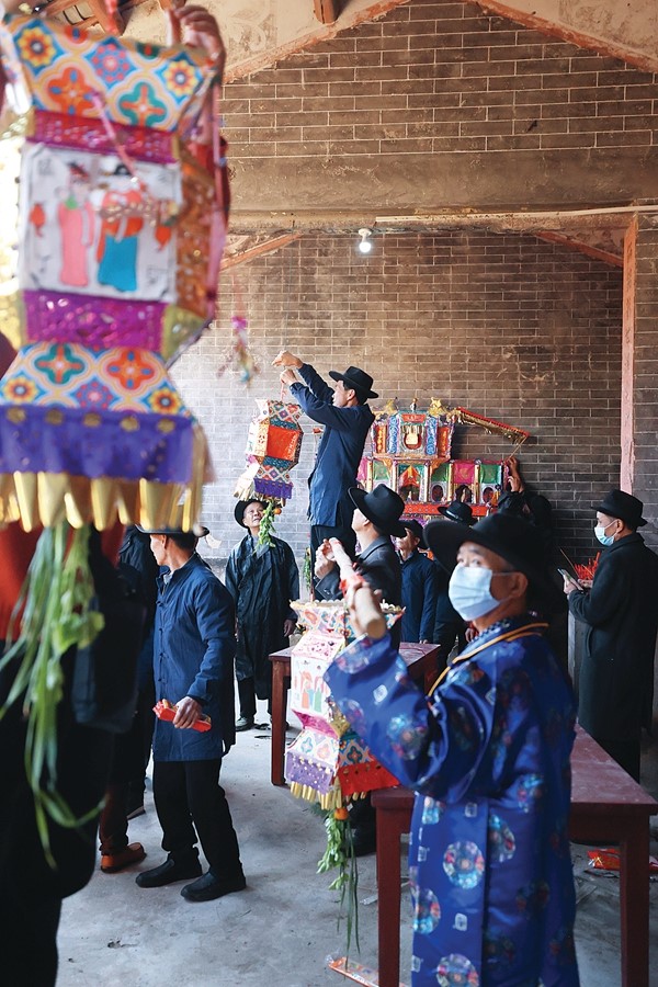 村民把接回的燈掛在祠堂。