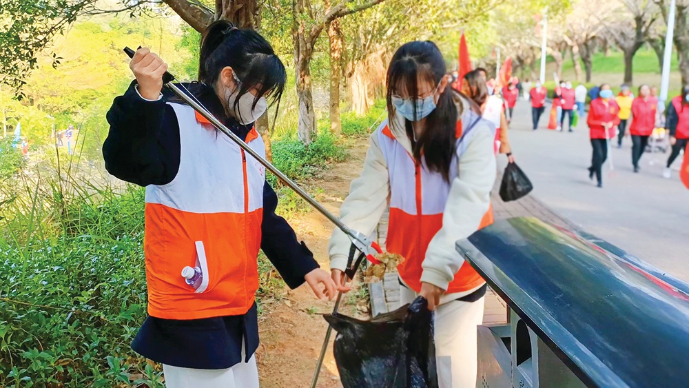 啟動(dòng)儀式后,干部群眾在東山公園綠道開展撿跑活動(dòng)。大家手拿塑料袋和長夾,邊跑邊撿,將沿途路面、角落里的煙頭、紙巾、瓶蓋等垃圾全部撿到垃圾袋中,并向周邊群眾宣傳健康生活方式和城市文明理念。在這片春意盎然的景色里,志愿者撿跑的身影格外顯眼,構(gòu)成了全民參與共創(chuàng)文明城市的美好圖畫。