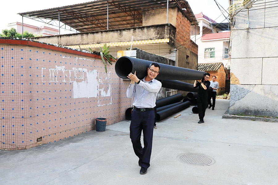 “一、二、三,起!”日前,記者來到柏市村,只見余屋、何屋、芳合3個村民小組的施工現(xiàn)場一片忙碌,駐鎮(zhèn)幫鎮(zhèn)扶村工作隊隊員正利用空閑時間加入施工隊伍。排污管網(wǎng)的施工需要搬運(yùn)材料,工作隊隊員二話不說,擼起袖子就干了起來,兩人一組將一根根排污管抬到施工地點(diǎn)。