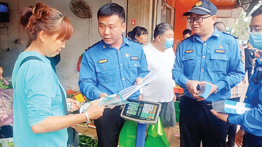 執(zhí)法人員給商戶派發(fā)宣傳資料;葜萑請笥浾吆钔疋 攝