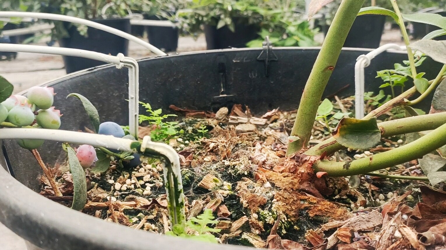 每棵藍(lán)莓的盆內(nèi)安裝有滴箭,分別連接著貫穿大棚的管道。