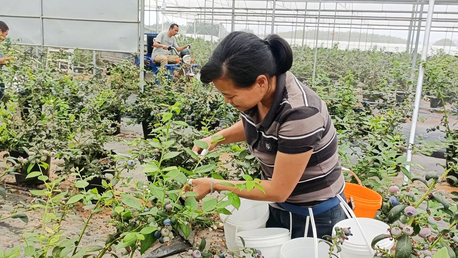 項(xiàng)目的落地,也為周邊將近90名村民帶來(lái)了“家門(mén)口”就業(yè)的崗位。連月來(lái),適逢采收期,藍(lán)莓園里務(wù)工的村民達(dá)到約100人。家住長(zhǎng)寧鎮(zhèn)圩鎮(zhèn)的廖秀文便是其中一個(gè)。每天清晨七點(diǎn),她便騎上電動(dòng)車(chē),前往博羅智源設(shè)施藍(lán)莓園務(wù)工!皝(lái)這邊幫著剪剪果,一天上班8個(gè)小時(shí)就能掙100多,像我這個(gè)年紀(jì),去不了廠里上班,這個(gè)收入已經(jīng)很不錯(cuò)了。”廖秀文笑著說(shuō)道。