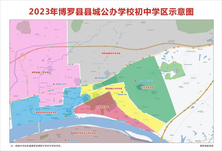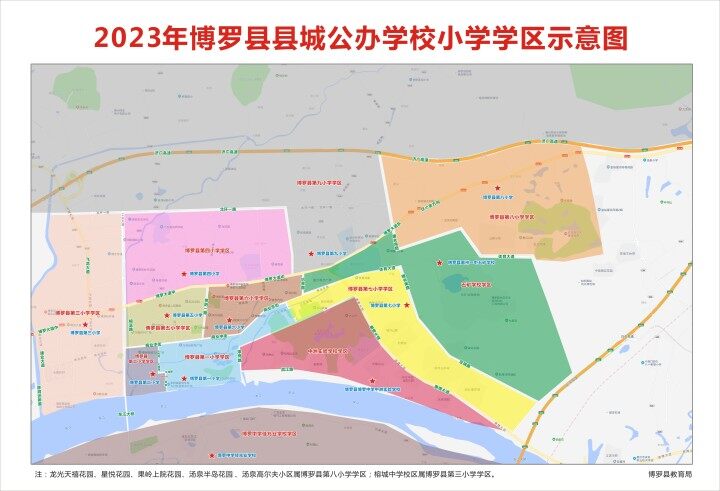 從學(xué)區(qū)劃分示意圖來(lái)看,縣城(羅陽(yáng))學(xué)區(qū)范圍相比去年有所調(diào)整。由于縣第二小學(xué)投用,周邊區(qū)域如西北路、環(huán)城路等不再納入縣第一小學(xué)學(xué)區(qū);縣城工業(yè)大道往西區(qū)域如水西新村、金域華府小區(qū)等就近納入縣第三小學(xué)學(xué)區(qū)。此外,富力現(xiàn)代廣場(chǎng)、禧臨門小區(qū)等改納入博羅縣惠州一中五礦學(xué)校學(xué)區(qū)。
