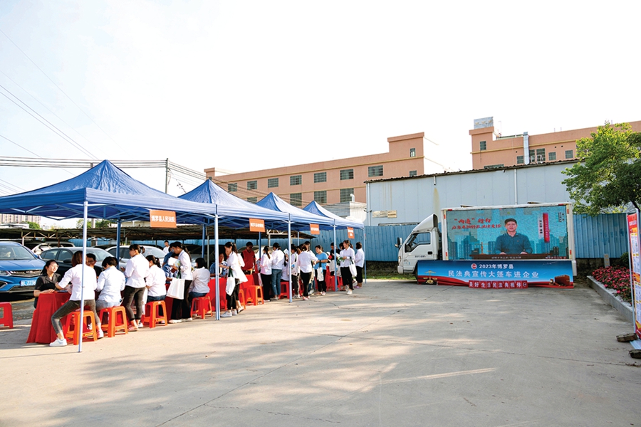 根據(jù)企業(yè)需求,博羅法院定制并派出“服務(wù)單”。今年5月是民法典宣傳月,期間這一做法收到良好效果。用大篷車“典”亮依法營商路,是博羅法院與司法、檢察以及環(huán)保部門聯(lián)合推出的企業(yè)普法專項(xiàng)之一。此次普法專項(xiàng)抓住企業(yè)和企業(yè)員工的關(guān)注點(diǎn),通過法治宣傳“大篷車”+現(xiàn)場法律服務(wù)的方式開展:“大篷車”循環(huán)播放相關(guān)視頻,現(xiàn)場設(shè)置法律咨詢臺、擺放主題展板,供企業(yè)員工“流動式”、自助式參觀學(xué)習(xí);法院干警為企業(yè)員工宣講企業(yè)經(jīng)營活動常用法律知識,解答涉企或涉職工切身利益法律咨詢,以高效、便捷、暖心的司法服務(wù)護(hù)航企業(yè)發(fā)展。