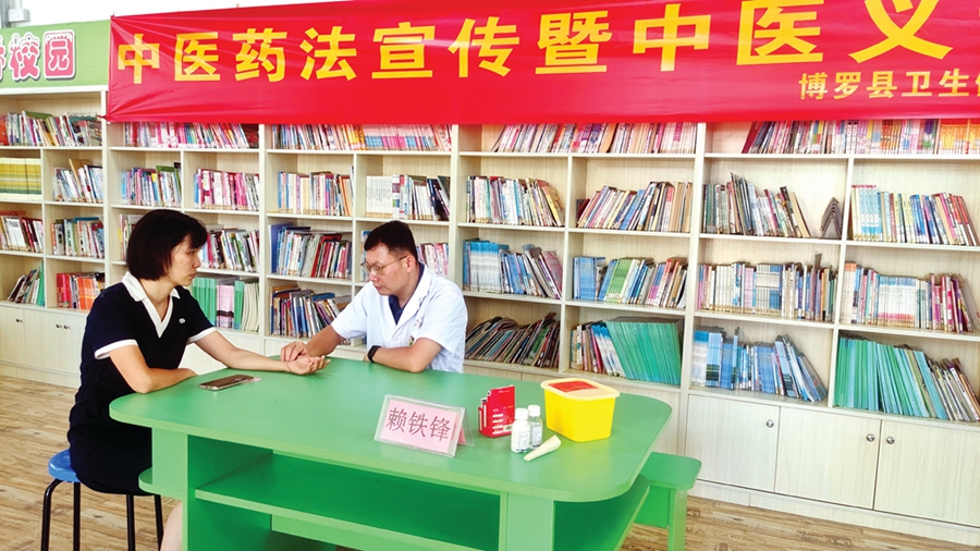 “久坐對腰椎和肩頸不好,平常也要注意坐姿!薄搬樉哪軌蚓徑膺@個(gè)癥狀,待會(huì)可以體驗(yàn)一下!痹诎靥林行男W(xué)的課室內(nèi),來自博羅縣中醫(yī)醫(yī)院、柏塘鎮(zhèn)衛(wèi)生院等醫(yī)院的醫(yī)生分別為該校教職工開展中醫(yī)問診、中醫(yī)推拿、針灸、三伏貼等中醫(yī)藥特色義診服務(wù)。博羅縣衛(wèi)生健康局、柏塘鎮(zhèn)衛(wèi)生院、博羅縣育苗家庭教育促進(jìn)會(huì)等部門機(jī)構(gòu)還為該校教職工準(zhǔn)備了養(yǎng)生茶飲等藥膳。