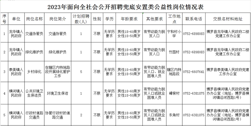 為加強鄉(xiāng)村公共就業(yè)服務(wù)隊伍建設(shè),夯實鄉(xiāng)村振興人才支撐,大力推動兜底安置類公益性崗位(含鄉(xiāng)村公益性崗位)開發(fā),根據(jù)《廣東省人力資源和社會保障廳 廣東省財政廳關(guān)于修訂印發(fā)<廣東省兜底安置類公益性崗位開發(fā)管理辦法>的通知》(粵人社規(guī)〔2020〕13號)和市人社局《關(guān)于做好惠州市2023年兜底安置類公益性崗位開發(fā)工作的通知》(惠市人社函〔2023〕144號)文件要求,結(jié)合博羅縣工作實際,現(xiàn)將公益性崗位公開招聘有關(guān)事項公告如下: