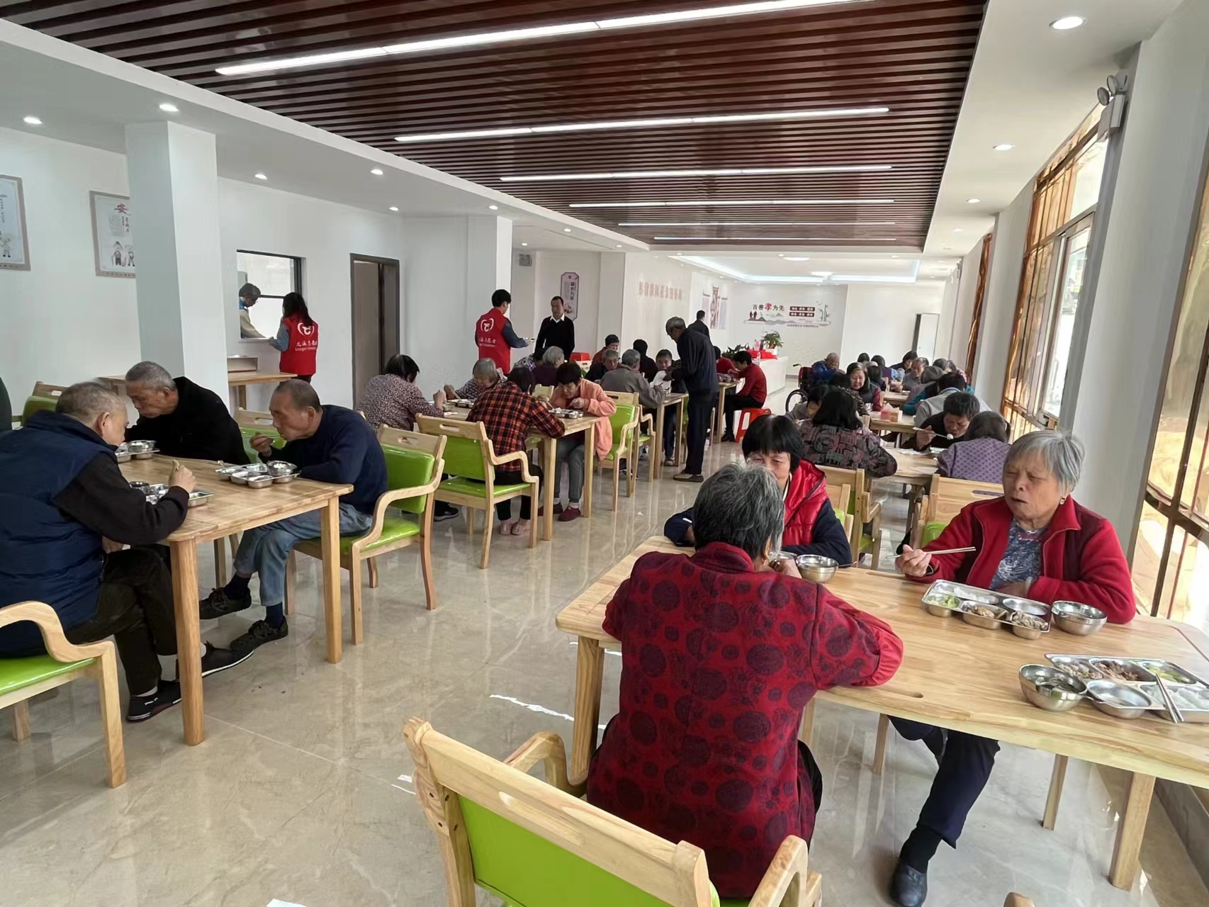 揭牌儀式后,長(zhǎng)者們?cè)陂L(zhǎng)者飯?zhí)贸粤宋绮。用餐過(guò)程中,工作人員和志愿者為長(zhǎng)者們登記身份信息并填寫助餐申請(qǐng);現(xiàn)場(chǎng)了解長(zhǎng)者們的體驗(yàn)感受,并對(duì)有意向在長(zhǎng)者飯?zhí)镁筒腿藛T進(jìn)行登記。用餐時(shí),長(zhǎng)者們圍坐在餐桌上拉家常,享用美味飯菜,臉上洋溢著幸福的笑容。蘇阿姨點(diǎn)贊說(shuō):“這里的飯菜味道好,就餐環(huán)境也好,吃飯還有補(bǔ)貼,為我們帶來(lái)了很大的便利。”在老人眼里,長(zhǎng)者飯?zhí)镁褪恰靶腋o執(zhí)谩薄?