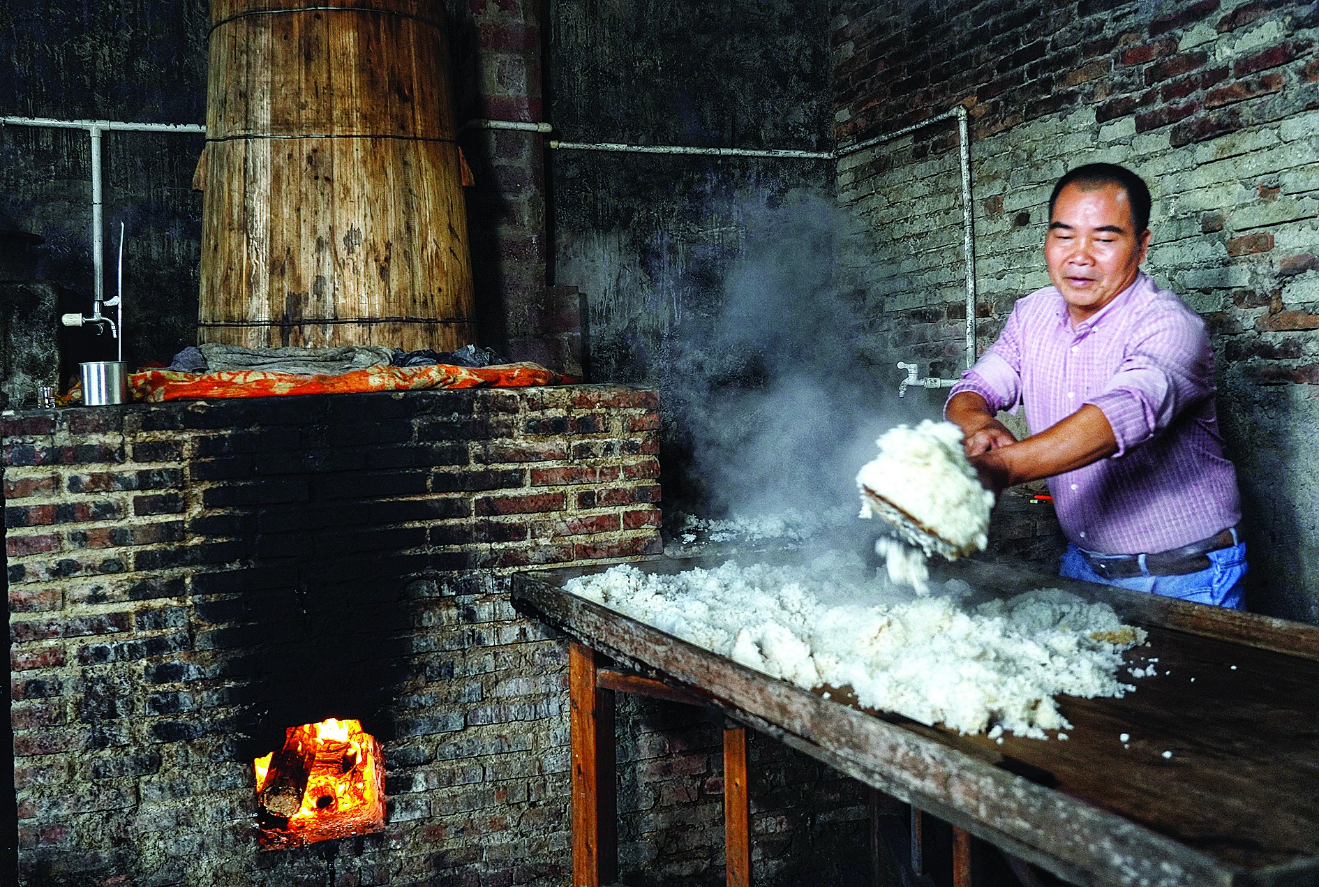 這樣的操作流程,釀酒人楊容添和妻子毛偉英每天都要重復(fù)好幾次。土法釀酒產(chǎn)量并不高,通常50斤米蒸成一鍋飯來釀酒,大概150斤大米能釀出100斤45度的米酒。
