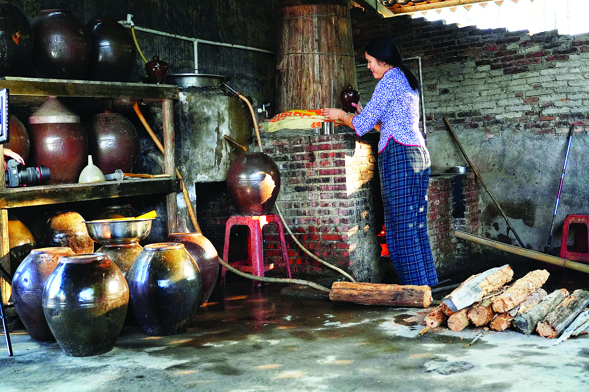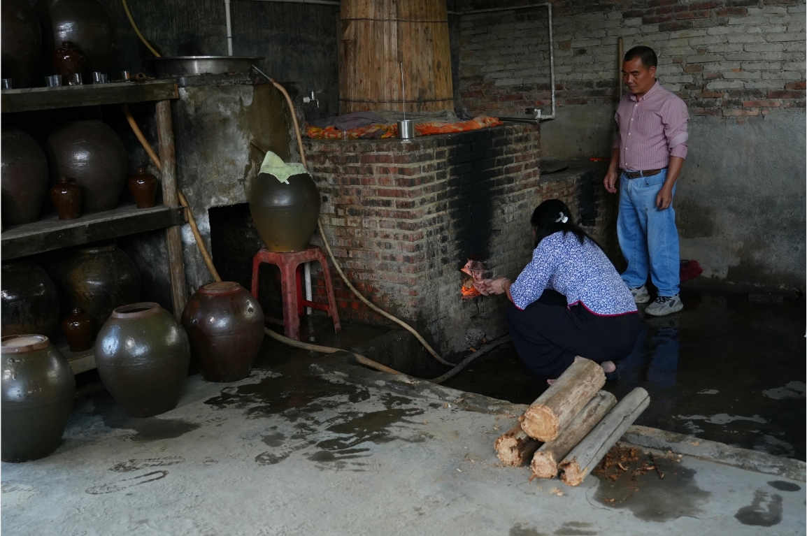 放柴火慢燒釀酒。