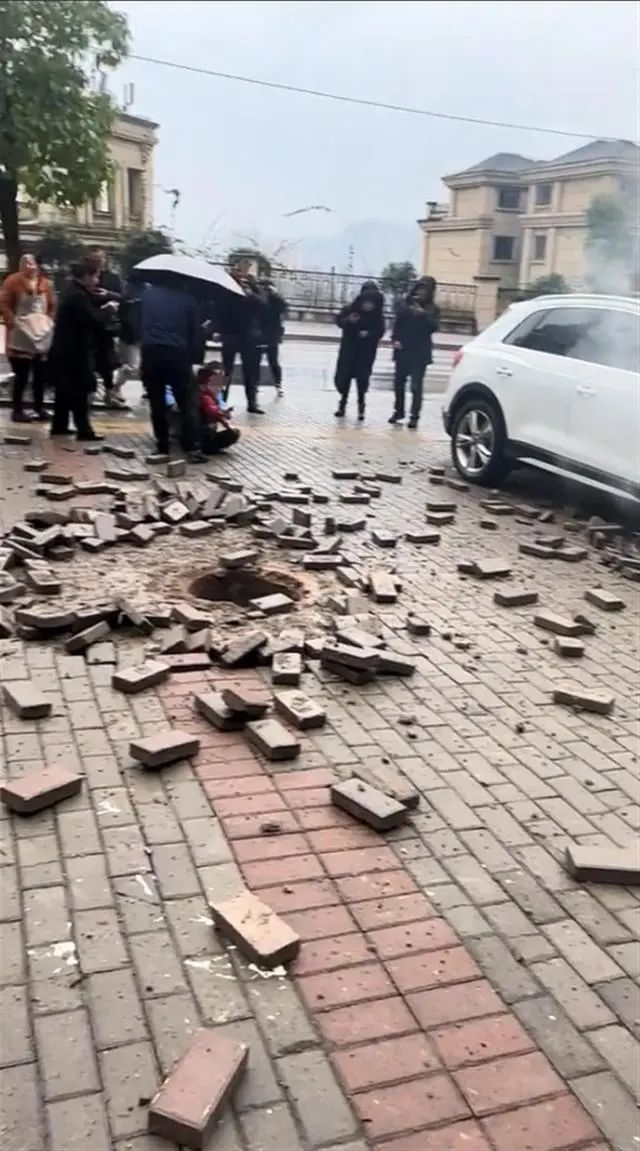 被炸井蓋附近停放的汽車車身冒煙,磚塊散落一地(網(wǎng)絡(luò)截圖)。