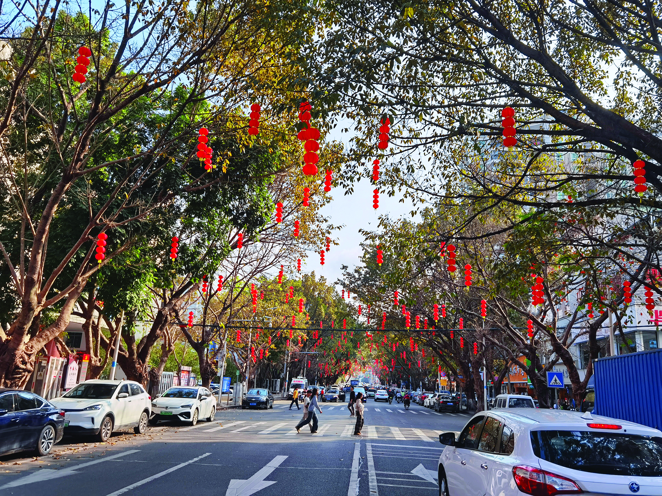 一串串紅燈籠掛在綠化樹上,一株株鮮花正迎春綻放,一派喜氣洋洋和生機(jī)勃勃的景象。