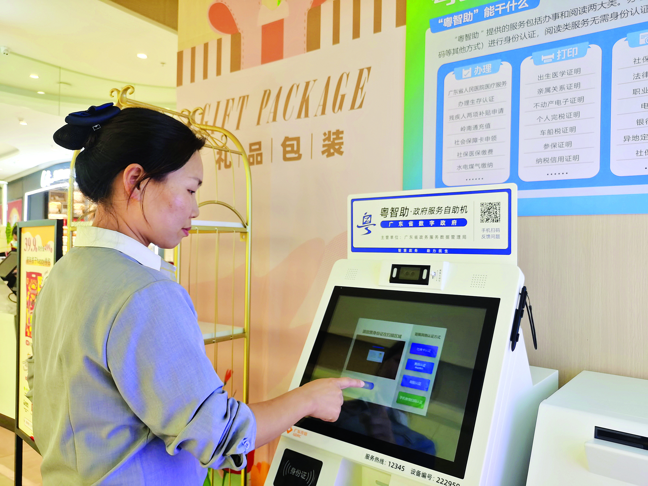 記者在博羅天虹購(gòu)物中心一樓服務(wù)臺(tái)旁看到,這里安裝了一臺(tái)“粵智助”政府服務(wù)自助機(jī),張貼了機(jī)器功能介紹海報(bào),方便過(guò)往群眾自主辦理業(yè)務(wù)。劉女士介紹,她在逛街時(shí)看到宣傳海報(bào),動(dòng)動(dòng)手指選擇所辦業(yè)務(wù)事項(xiàng),輸入姓名等個(gè)人信息,通過(guò)人臉識(shí)別登錄,很快就輕松辦理了社保繳交證明打印,“逛個(gè)街就能輕松辦理業(yè)務(wù),不用特地上班時(shí)間跑一趟,太贊了!”