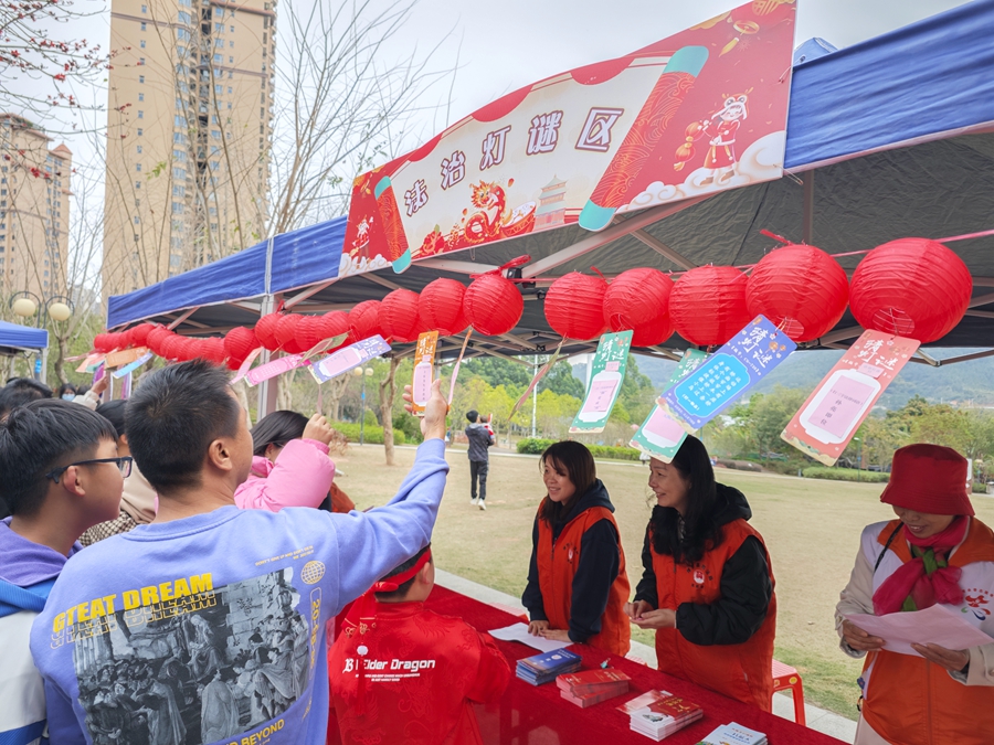 在“法治燈謎區(qū)”,紅彤彤的“法治燈籠”迎風招展,每個謎語都與法律常識緊密結(jié)合,涉及憲法、民法典、禁毒、未成年人保護法等,極具法治文化的燈謎引來眾多市民駐足競猜。