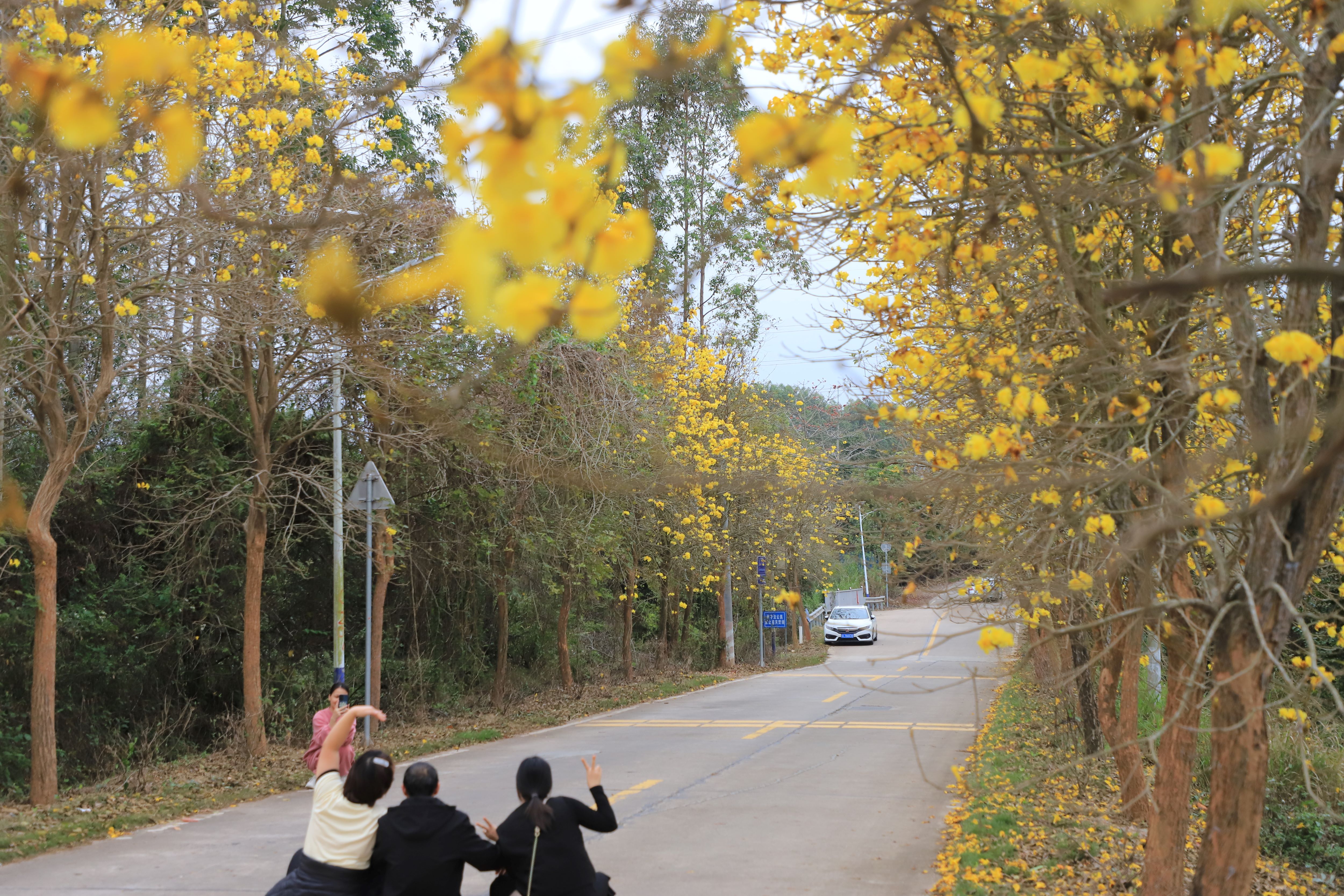 看繁花似錦,這里美得純粹,延綿幾公里,黃花相隨。在博羅縣楊僑鎮(zhèn)朝田辦事處,順著村道前行,黃花風(fēng)鈴木迎春綻放,這一抹耀眼的金黃成為楊僑時下最美的風(fēng)景,吸引八方游客前來。