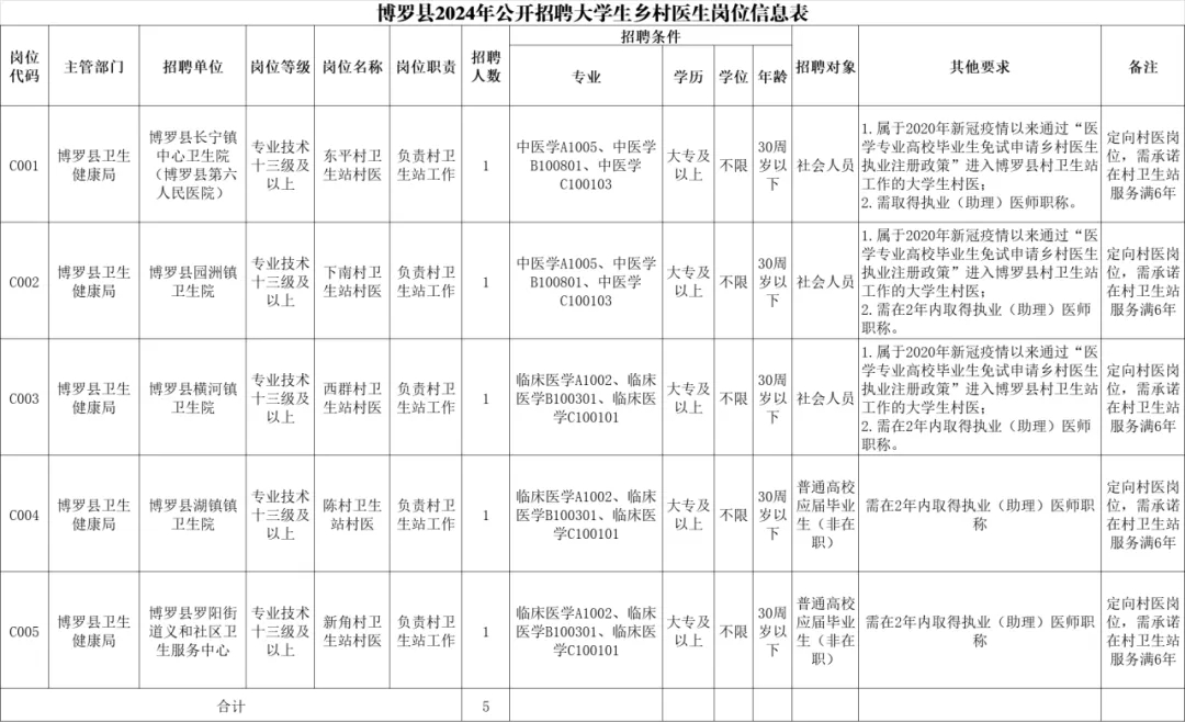 為解決我縣鄉(xiāng)村醫(yī)生緊缺的問題,改善我縣鄉(xiāng)村醫(yī)生人才隊伍結(jié)構(gòu),提高醫(yī)務(wù)工作者整體素質(zhì),根據(jù)《廣東省事業(yè)單位公開招聘人員辦法》(粵府令第301號)《廣東省衛(wèi)生健康委辦公室關(guān)于加快推進大學(xué)生鄉(xiāng)村醫(yī)生專項編制保障和公開招聘工作的通知(粵衛(wèi)辦基層函〔2024〕7號)》精神,貫徹落實“鎮(zhèn)招村用”有關(guān)要求,經(jīng)博羅縣衛(wèi)生健康局黨組研究決定,會同縣醫(yī)共體總院面向社會公開招聘大學(xué)生鄉(xiāng)村醫(yī)生共5名。具體公告如下: