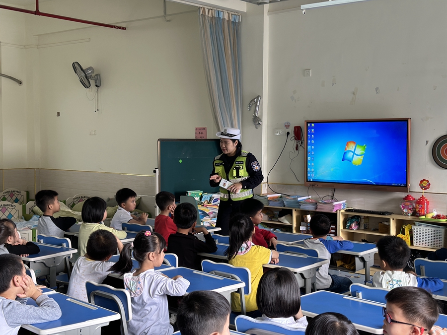 交警進(jìn)校園給學(xué)生普及交通安全知識。