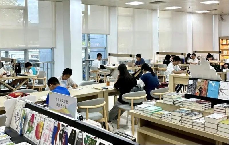 自習(xí)室內(nèi),4000余冊(cè)國(guó)內(nèi)外文學(xué)獎(jiǎng)獲獎(jiǎng)作品整齊地?cái)[放在書架上,50個(gè)閱讀席位分布在寬敞明亮的空間中,還配有臺(tái)燈、充電口、計(jì)算機(jī)、圖書消毒機(jī)、自助借還機(jī)等人性化配套設(shè)備。