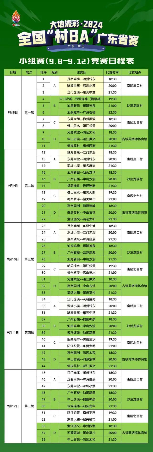 根據(jù)賽程,9月8日,2024全國(guó)“村BA”廣東省賽正式開(kāi)賽。首個(gè)比賽日,小組賽在中山市沙溪鎮(zhèn)龍瑞村、南區(qū)街道北臺(tái)村、古鎮(zhèn)鎮(zhèn)、南朗街道崖口村4個(gè)賽區(qū)同步開(kāi)打。