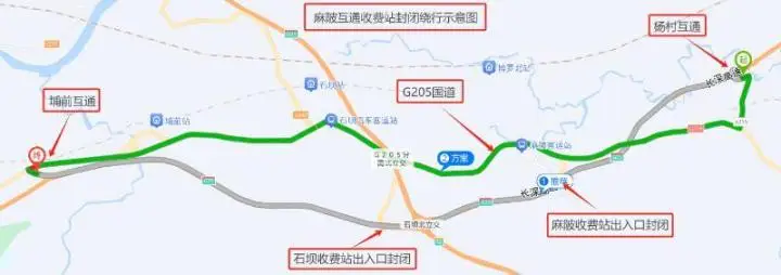 交通管制期間,長(zhǎng)深高速北往南行駛往博羅縣麻陂鎮(zhèn)的車輛,請(qǐng)?zhí)崆皬钠仪笆召M(fèi)站下高速繞行國(guó)道G205前往;長(zhǎng)深高速南往北行駛前往博羅縣麻陂鎮(zhèn)的車輛,請(qǐng)?zhí)崆皬臈畲迨召M(fèi)站下高速繞行國(guó)道G205前往。