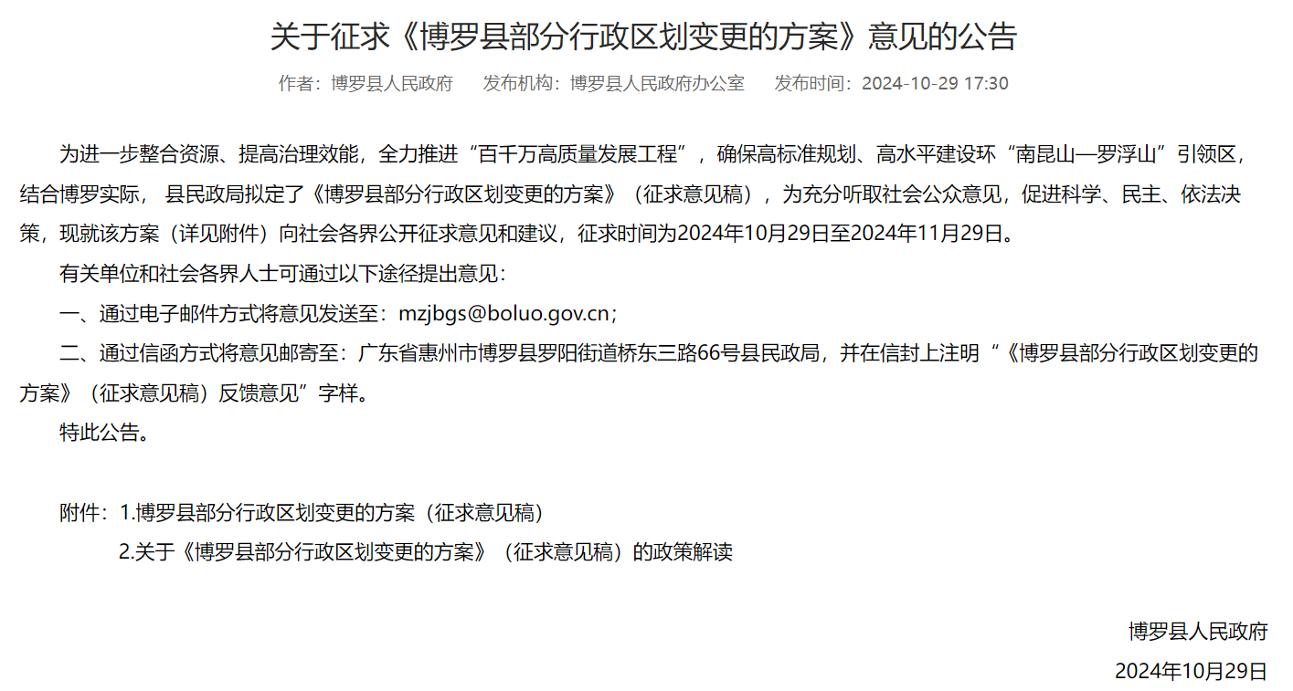 目前,《博羅縣部分行政區(qū)劃變更的方案》(征求意見稿)已發(fā)布在博羅縣人民政府網(wǎng)站公開征求意見,有關(guān)單位和社會各界人士可登錄網(wǎng)站了解詳情并反饋相關(guān)意見,意見征集截止時間為2024年11月29日。