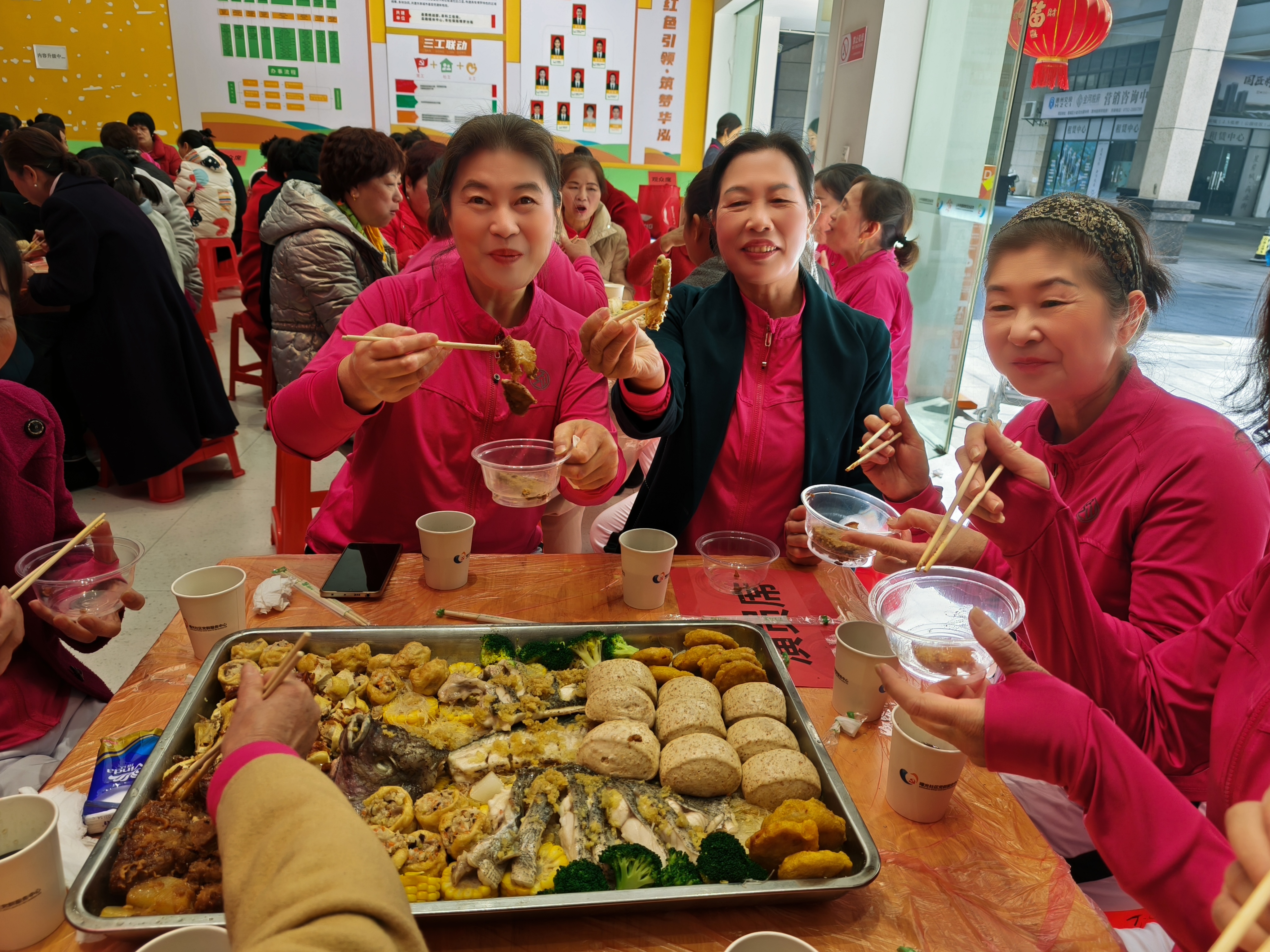 “來!大家收拾好桌面上的東西,準備上菜開飯啰!”隨著華泓社區(qū)工作人員的一聲吆喝,熱氣騰騰的大盆菜端了上來。居民余鵝志說:“菜式好,氛圍更好!社區(qū)一幫人一起吃,好熱鬧。”
