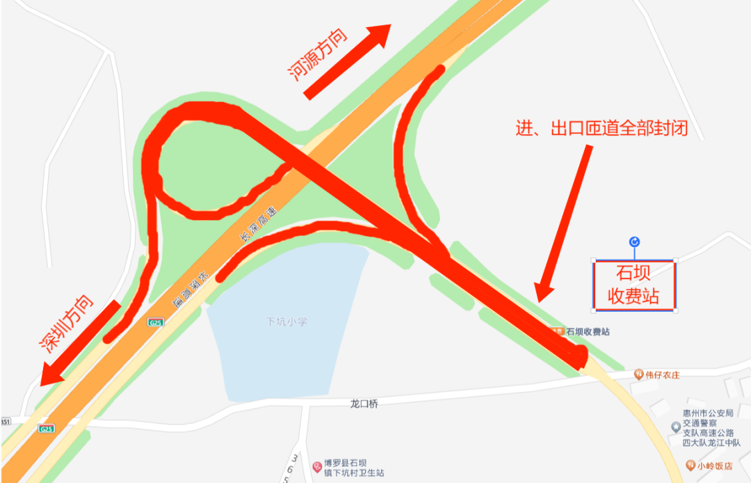 (二)管制措施。長(zhǎng)深高速公路惠州段(惠河高速公路)石壩收費(fèi)站進(jìn)、出口匝道全部封閉,禁止車輛通行。