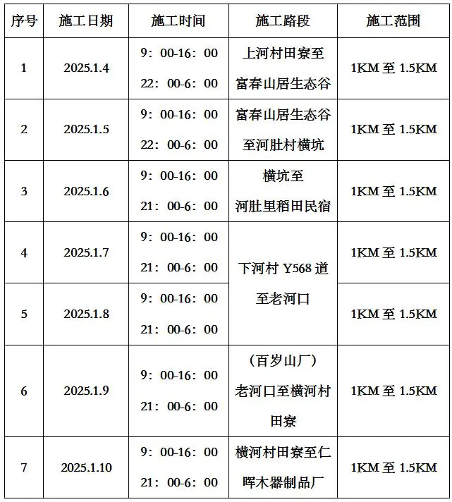 為了進(jìn)一步完善環(huán)南昆山—羅浮山縣鎮(zhèn)村高質(zhì)量發(fā)展引領(lǐng)區(qū)最美旅游公路建設(shè),由我中心負(fù)責(zé)組織實(shí)施省道S254線塘下至湖鎮(zhèn)段改造工程,為保證在春運(yùn)前順利完成工程改造任務(wù),減緩春運(yùn)壓力。決定于2025年1月4日至1月10日從橫河鎮(zhèn)上河村(里程樁號(hào)K0+000)至橫河鎮(zhèn)圩鎮(zhèn)(里程樁號(hào)K12+700)段進(jìn)行階段性瀝青攤鋪施工,期間將對(duì)施工區(qū)域路進(jìn)行全封閉施工(白天9:00至16:00;晚上22:00至6:00),為最大化降低對(duì)沿路村居民生活交通出行影響,現(xiàn)將詳細(xì)施工進(jìn)度計(jì)劃公布如下: