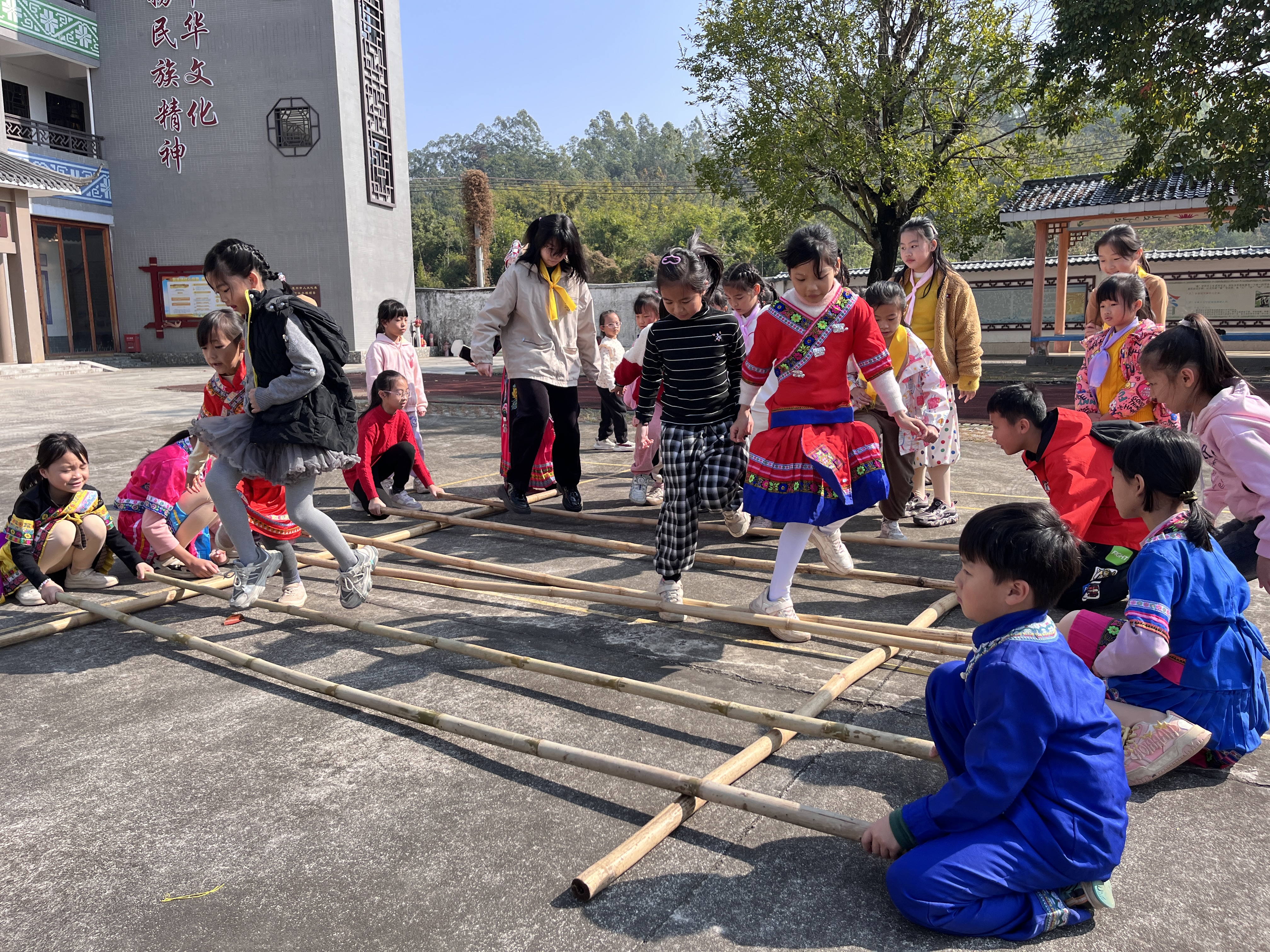“跳,跳,一起來……”竹竿舞歌聲響起,歡快的節(jié)奏瞬間感染了所有人。在畬族小朋友的示范下,孩子們躍躍欲試,小心翼翼地踏入開合的竹竿間,跟著節(jié)奏跳起竹竿舞,F(xiàn)場加油聲、歡笑聲交織一片。活動還特別安排了來訪小朋友才藝表演環(huán)節(jié),精彩的表演深深地吸引了畬族小朋友。
