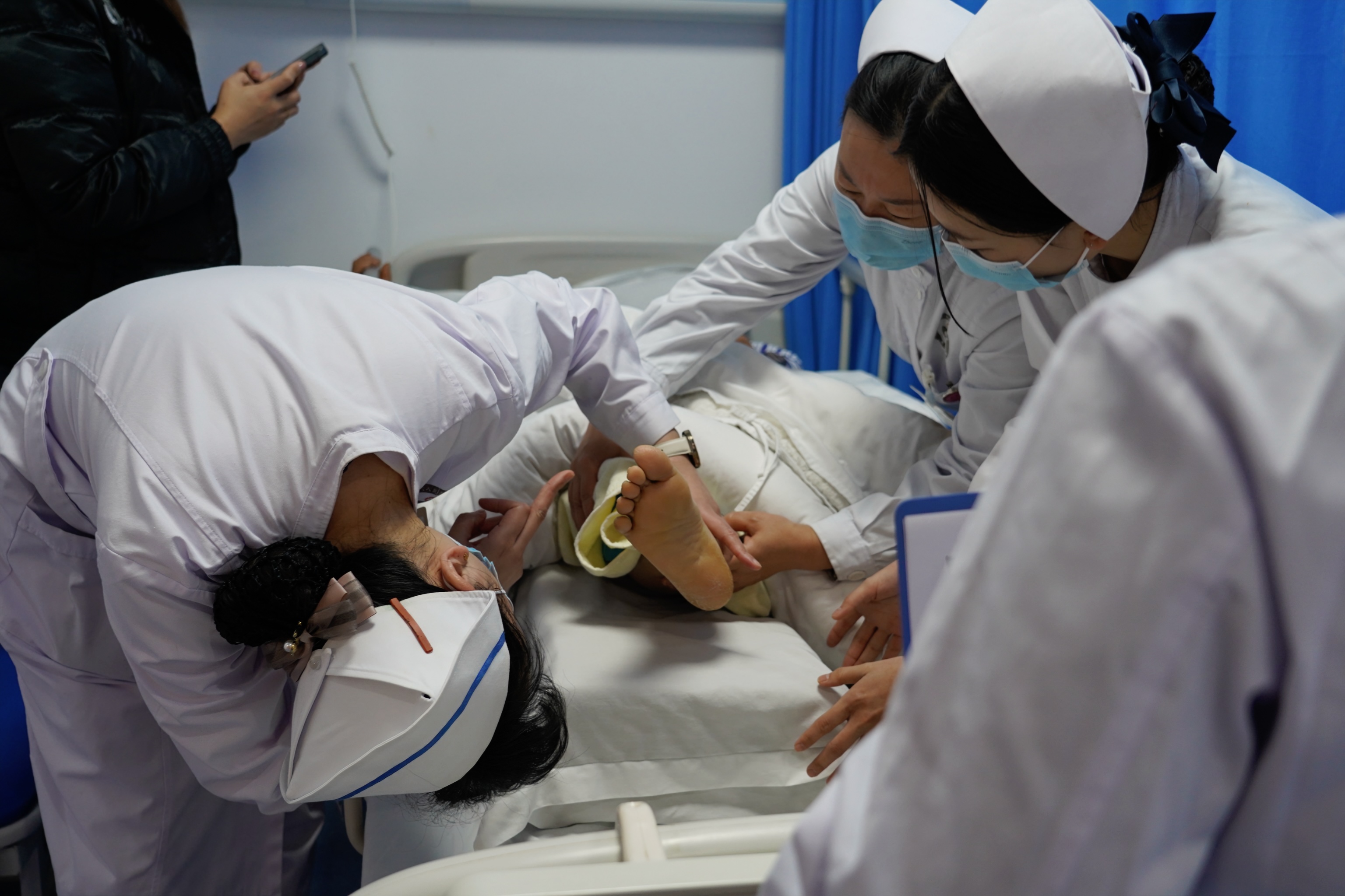脊柱外科護(hù)士長(zhǎng)龍婷指導(dǎo)團(tuán)隊(duì)為患者做護(hù)理。
