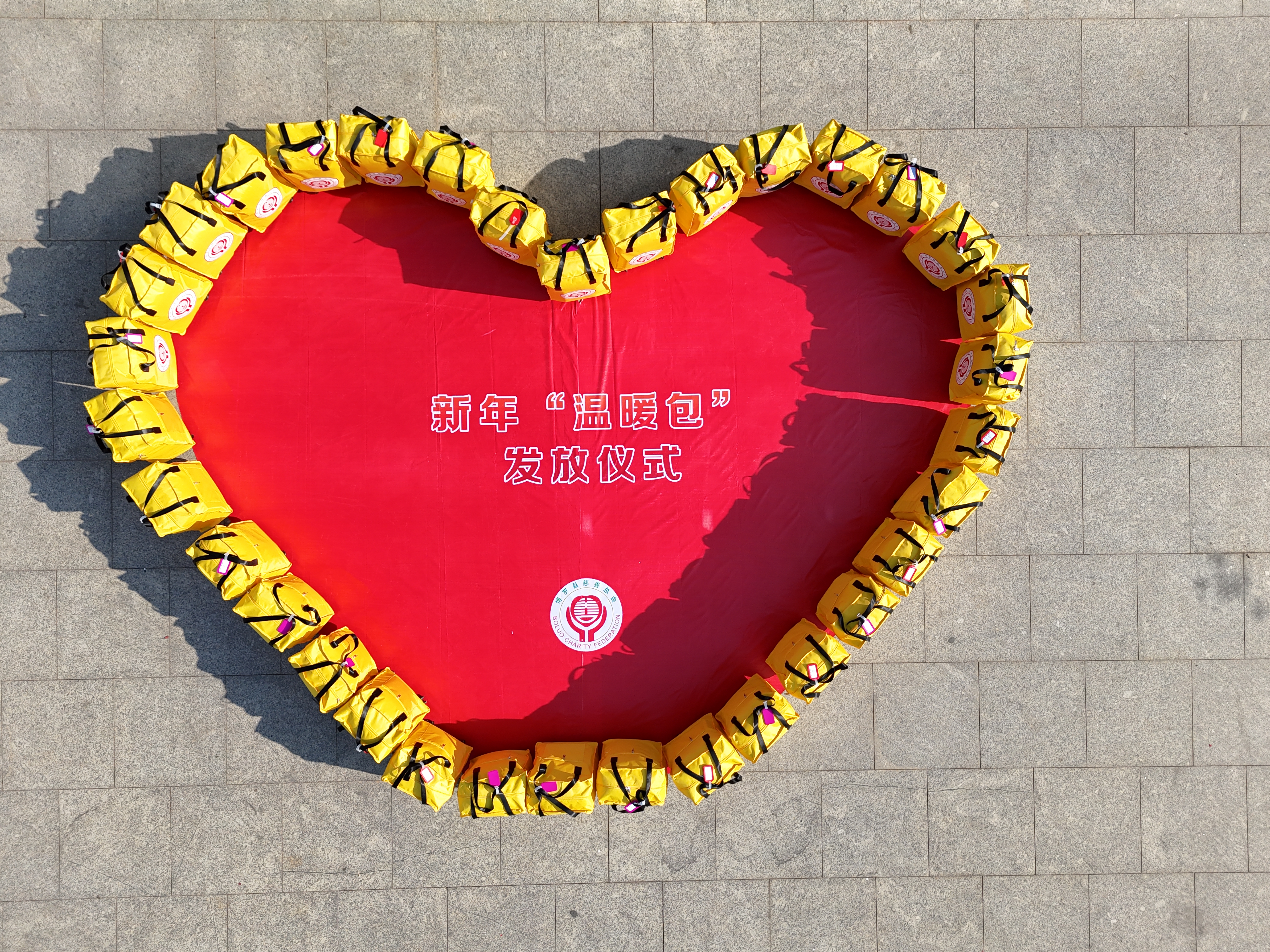 “新年溫暖包”整齊擺放成心形。 惠州日?qǐng)?bào)記者黃桃 通訊員龍溪宣 攝