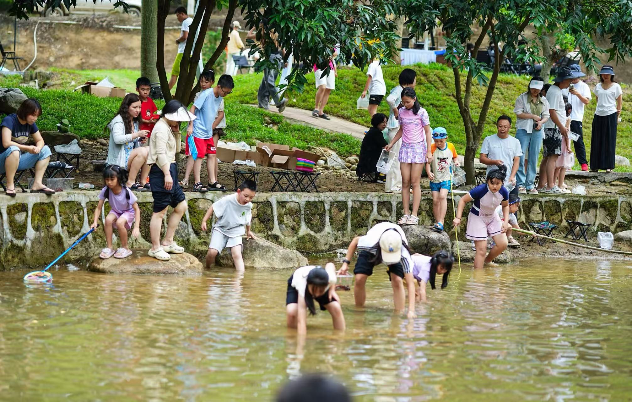 孩子們在黎光村惠州心野輕奢營地摸泥鰍;葜菪囊拜p奢營地供圖