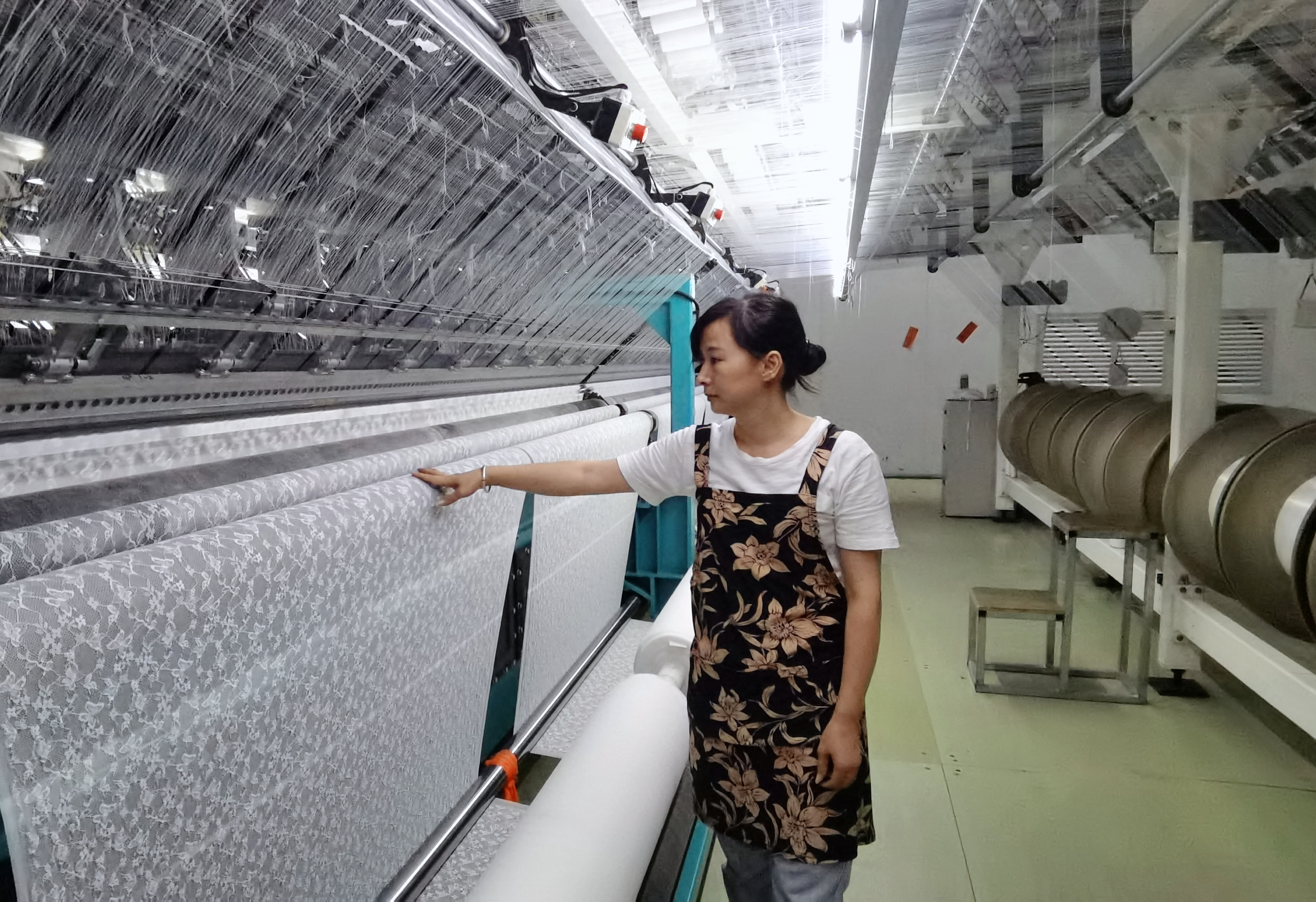 位于園洲鎮(zhèn)的廣東中康織繡科技有限公司生產(chǎn)車間里,工人正檢查蕾絲生產(chǎn)情況;葜萑請笥浾咧禧愭 攝